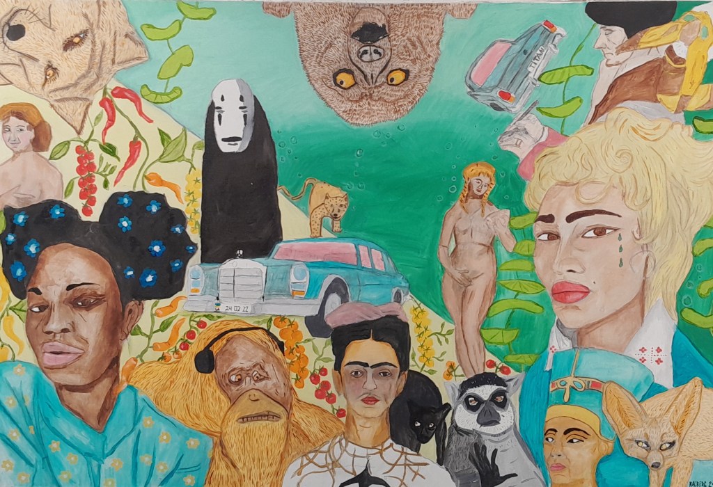 The sub-theme of the Greenhouse and Oceans Dreams paintings is humanity’s focus on the resources located in the depths of the planet’s oceans and the environmental impacts that this entails. In addition, the paintings have found a place for influences from important events in the world – the war in Ukraine and the protests in Georgia.