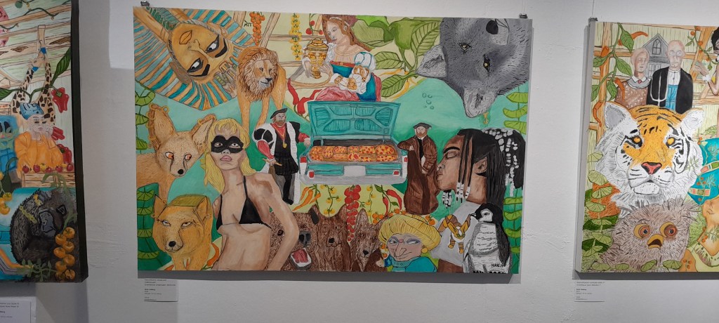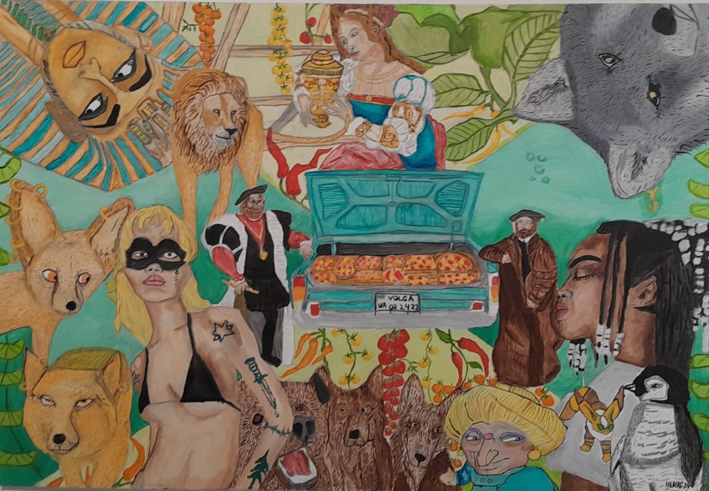 The main component of the Greenhouse and Oceans Dreams painting series is a love of botany, growth and diversity, combined with an awareness of climate and environmental change. In addition, different animals represent different characters of modern society, characters from pop culture, films, animation and art history. All together in this moment.