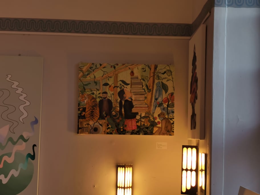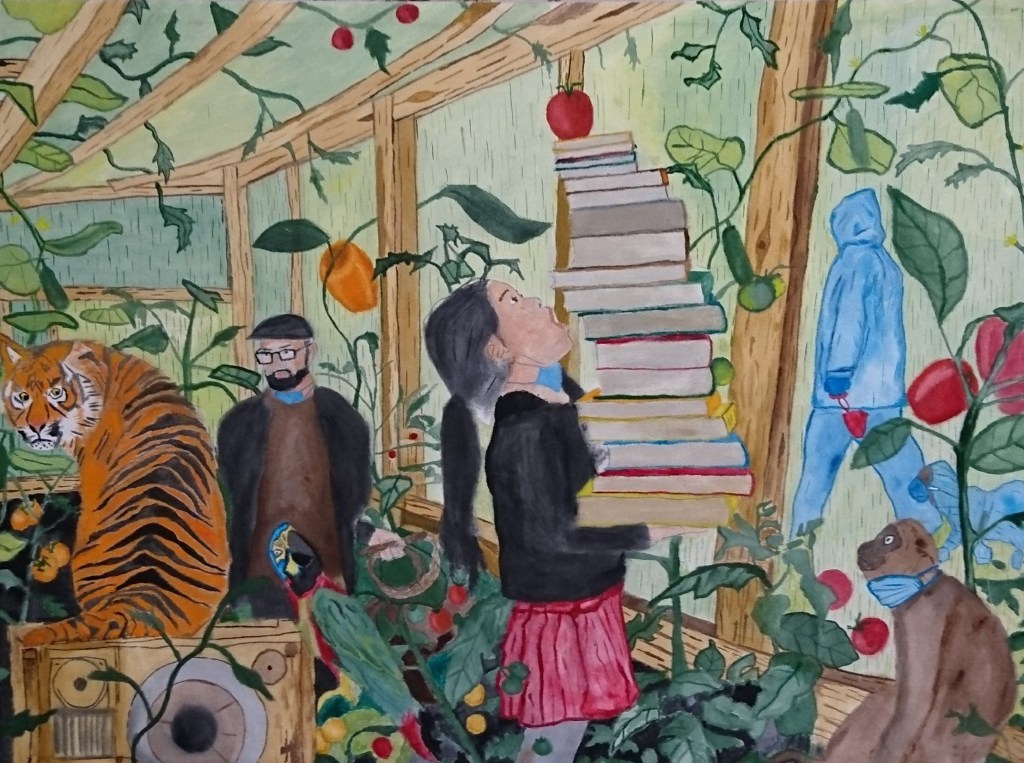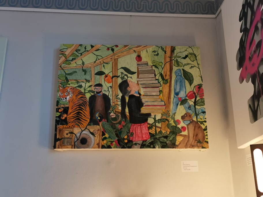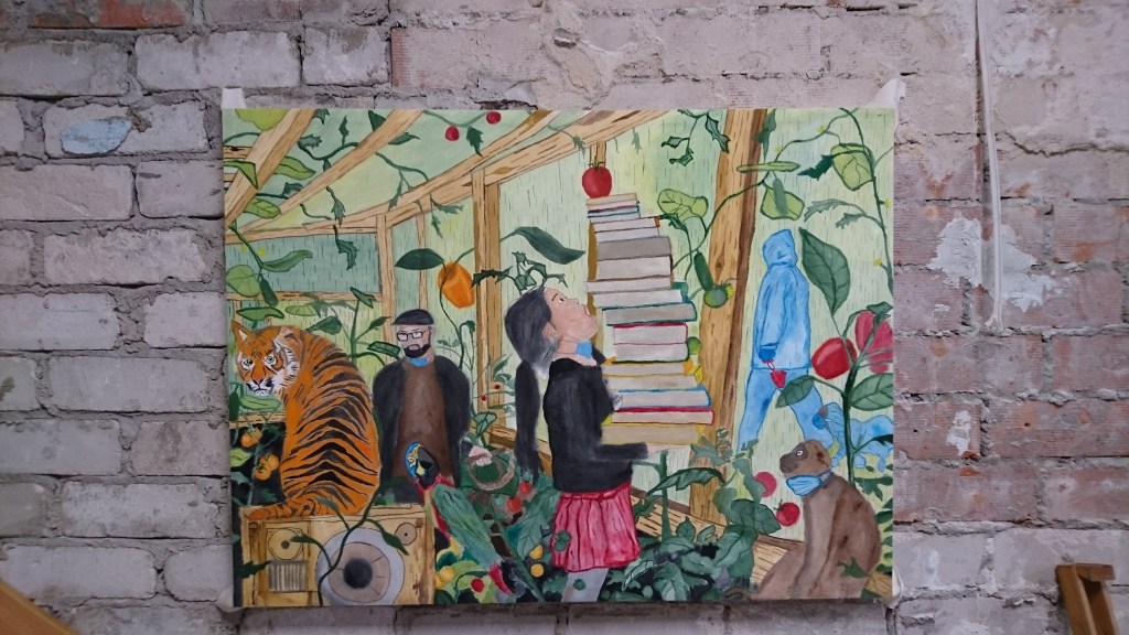 In “Greenhouse Pandemic two” are tiger, tamer, parrot, girl with books, dogwalker with dog and small monkey with corona mask.