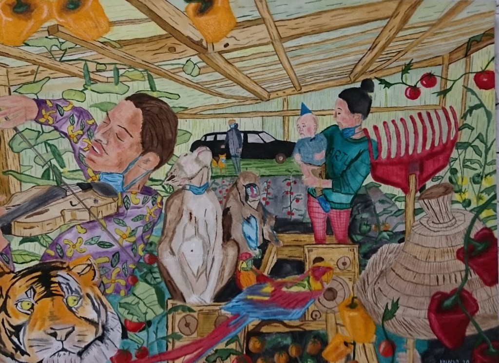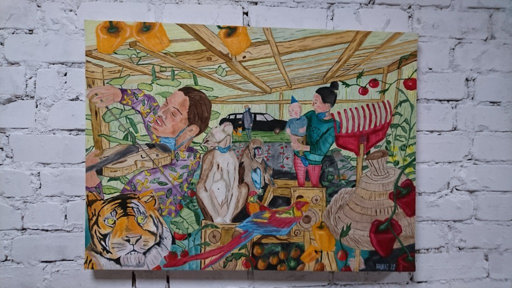The paintings scene takes place in a greenhouse, where a violinist, with a corona mask, plays music, a tiger from Tiger King watches a mother with a child, there is also a Mandrill monkey, a Shimpans, 2 parrots and a samurai gardener, inspired by 80s cult classic movie Big trouble in little China and in a background stands dog walker in front of a limousine. All around are tomatoes, peppers, cucumbers – all in different colours and shapes, growing together. There is an ongoing pandemic.
