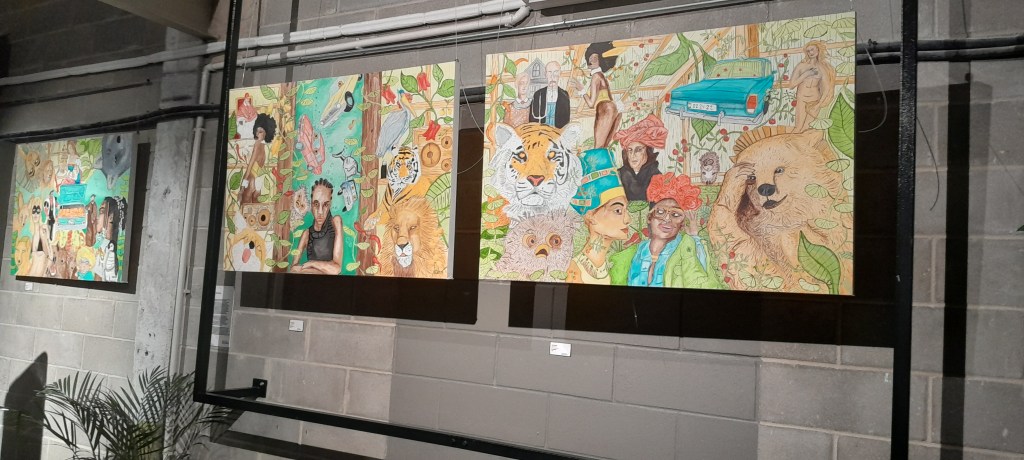 The main component of the Greenhouse and Titan painting series is a love of botany, growth and diversity, combined with an awareness of climate and environmental change. In addition, different animals represent different characters of modern society, characters from pop culture, films, animation and art history. All together in this moment.